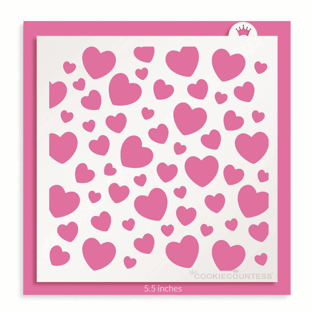 Large and small scattered hearts make this stencil perfect for Valentine's Day, weddings, and anniversaries.