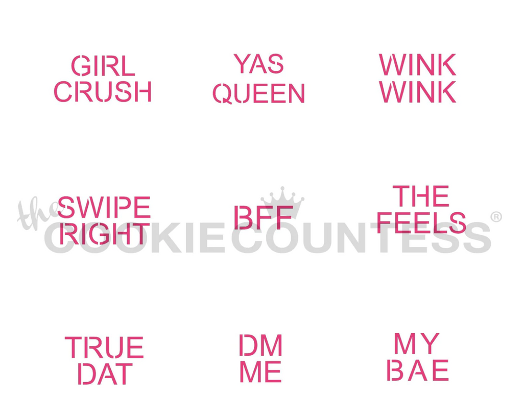 9 separate designs on one stencil: girl crush, yas queen, wink wink, swipe right, bff, the feels, true dat, DM me, my bae.