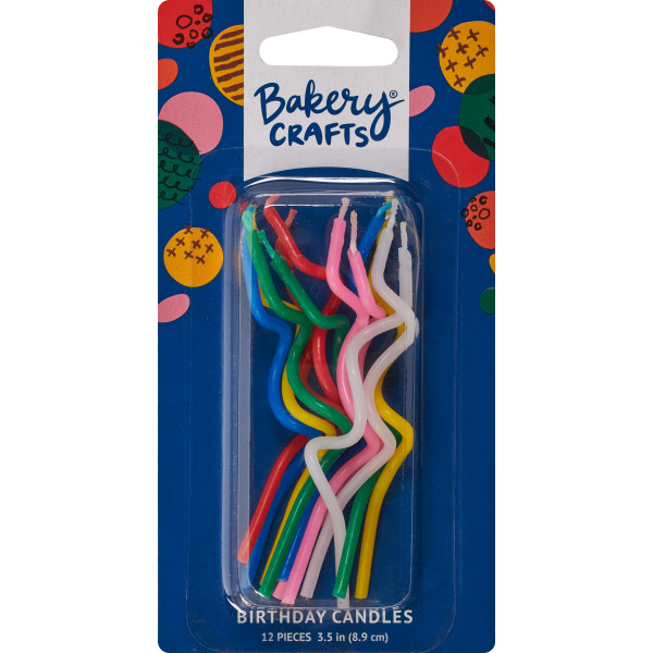 These birthday candles are sure to light up the room. Assortment includes yellow, green, red, white, pink, and blue twisted candles. 12 packages of candles per box.