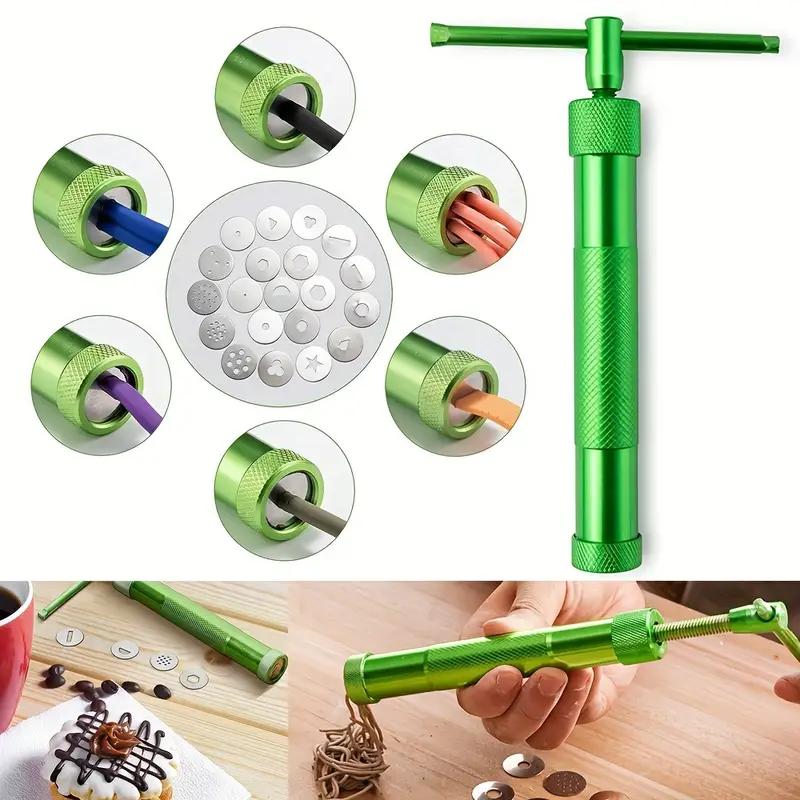 The clay extruder has many uses. These round discs are perfect for vines, stems, border and letters, use the screen discs for hair, grass and floral stamens, the flat slot discs for weaving baskets, lattice, ribbons and bows, use the square, triangle and half round discs for bricks, logs, borders or cut and use for beads, other shapes are teardrop, clover and hexagon.
